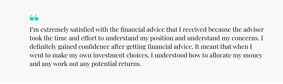 I’m extremely satisfied with the financial advice that I received because the adviser took the time and effort to understand my position and understand my concerns. I definitely gained confidence after getting financial advice. It meant that when I went to make my own investment choices, I understood how to allocate my money and any work out any potential returns.