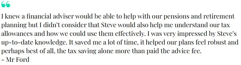 I knew financial advice was important for our pensions, but I didn’t realise how much Steve could help us understand our tax allowances and optimise them. He was incredibly knowledgeable, and his advice saved us both time and money. In fact, the tax savings alone covered the cost of the advice, which felt like a real win for us.