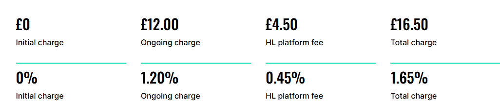 The HL platform fee is our charge for looking after your investments, which won't be over 0.45% per year. Both of these charges will be payable if you want to hold the fund with HL, amounting to a maximum of just 1.63% in total per year. The above example assumes no growth.