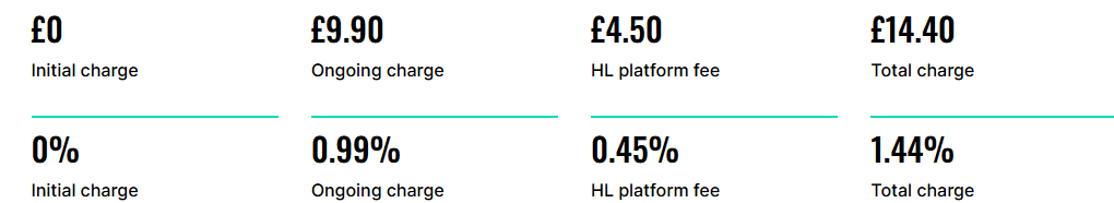 The HL platform fee is our charge for looking after your investments which won't be over 0.45% per year. Both of these charges will be payable if you want to hold the fund with HL, amounting to a maximum of just 1.53% in total per year. The above example assumes no growth.