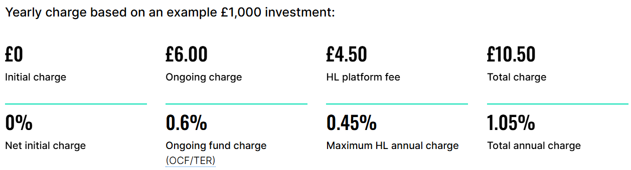 The ongoing charge is fixed and taken directly from the fund. This covers the management of the fund and all expenses other than transactional fees, which are incurred by all funds when shares are bought or sold. The HL charge is our platform charge which won't be over 0.45%. Both of these charges will be payable if you want to hold the fund with HL, amounting to a maximum of just 1.05% in total.