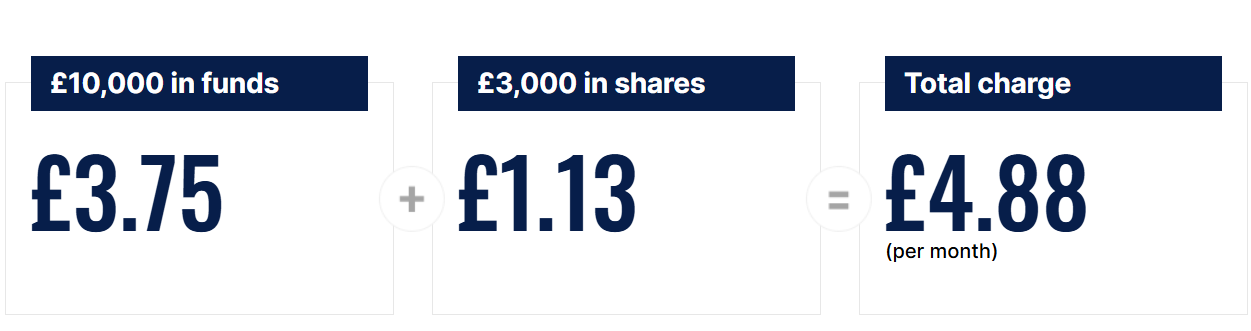 If you hold £10,000 in funds and £3,000 in shares, your account charge would be £58.50 per year. That's an average of £4.88* per month.