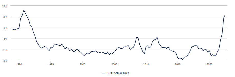 Their aim is to measure any price changes in this diverse range of goods and services over the past 12 months. It’s measured using the Consumer Price Index (CPI). This allows for a single value representation of how the price level of goods and services in an economy has gone up or down over time. Below we show the history of CPIH which includes owner occupiers’ housing costs.