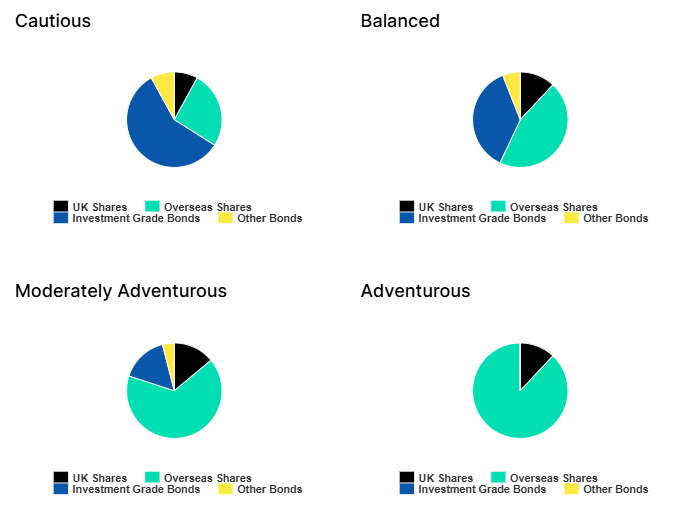 Below you can see some examples of how your portfolio might look, from a cautious portfolio to an adventurous one. These portfolios do not consider cash, however it’s important to build up an emergency savings pot before you start investing.
