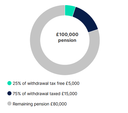 For example, if you had a £100,000 pension and made a £20,000 UFPLS withdrawal, usually £5,000 of that withdrawal would be tax free. The rest (£15,000) would be taxed as income. The remaining £80,000 stays invested as you choose and more lump sums can be taken in future.
