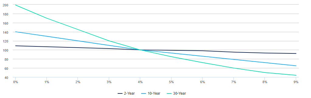 The below graph is an example of the correlation between yield and price changes on bonds with the same coupon but differing durations.